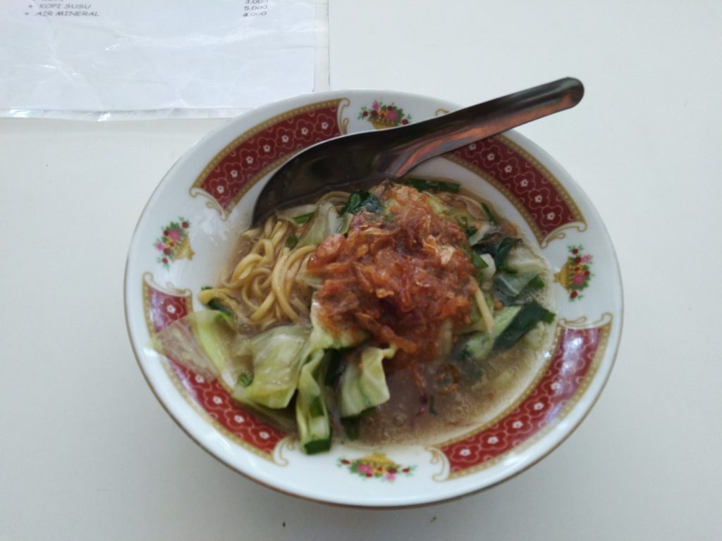 Porsinya kecil, kurang dari mangkuk mie instant. Saya memesan Mie Ongklok dengan rasa pedas sedang. Ada irisan cabe rawit di dalamnya, ada kucai, kol sebagai pelengkap mie dan di atasnya di taburi bawang goreng. Kuah mie ini kental karena di tambah tepung kanji. Untuk yang sedang diet, ini porsi ideal.